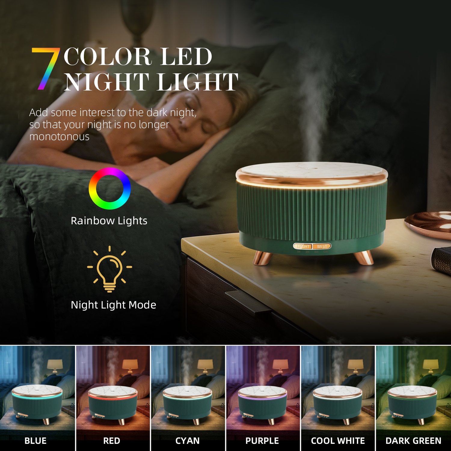 Control via remote or buttons. Choose from 7 light colors, 3 light modes, 4 timer settings, and 3 mist modes (heavy/light/intermittent).