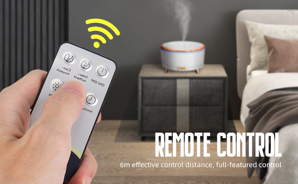 Control via remote or buttons. Choose from 7 light colors, 3 light modes, 4 timer settings, and 3 mist modes (heavy/light/intermittent).